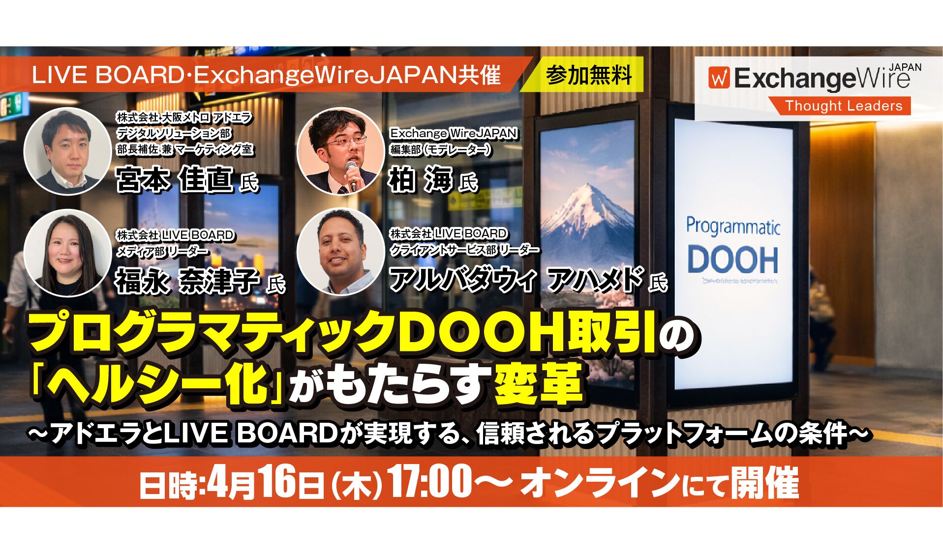 OOHのデジタルシフトが進み、広告主にとっては多様な表現を通じた効果的な広告配信が可能となってきた一方で、メディアオーナー(媒体社)にとっては販売チャネルや広告収益の拡大が、引き続きの課題となっている。デジタルOOH広告配信プラットフォームを運営する株式会社LIVE BOARDと、Osaka Metro Groupの広告事業を担う株式会社 大阪メトロ アドエラの担当者に、OOHにおけるプログラマティック取引の現在について話を聞いた。 【後編はこちら(URL)】 (Sponsored by LIVE BOARD) ※インタビュー出席者の名前・所属等は次のとおり。 (写真右)宮本佳直氏:株式会社 大阪メトロ アドエラ デジタルソリューション部 部長補佐 兼 マーケティング室 (写真中)福永奈津子氏:株式会社 LIVE BOARD メディア部 リーダー (写真左)アルバダウィアハメド氏:株式会社 LIVE BOARD クライアントサービス部 リーダー DSP経由でのプログラマティック取引と自社主導のインプレッション販売の両軸で広告主ニーズに応える ―まずは、これまでの2社のお取組みについて簡単にお聞かせください。 宮本氏:2022年9月より、新たな収益チャネルの創出を目的に、当社が所有する駅構内のデジタルサイネージをLIVE BOARDマーケットプレイスに接続し、DSP経由でのプログラマティック取引(SSP商流)を開始しました。当初は梅田駅、なんば駅などのOsaka Metro主要駅に設置されている「Osaka Metroネットワークビジョン」(合計261面)から接続を開始し、現在では「心斎橋コンコースビジョン」「本町ステーションサイネージ」へも接続を拡大しています。 さらに2024年12月からは、LIVE BOARD様のアドサーバを活用した自社主導のインプレッション販売(アドサーバ商流)もスタートし「SSP商流」と「アドサーバ商流」という 2つの販売経路を確立しました。 これら取り組みにより、従来の純広告に加えて、SSP商流とアドサーバ商流の両軸で媒体価値を提供できる体制が整い、より多様な広告主ニーズに応えられるようになっています。 ―具体的にはどのように使い分けをされているのでしょうか。 宮本氏:SSP商流は、LIVE BOARD様の営業力を生かした全国展開が可能なため、ナショナルクライアントを中心とした大型案件をいただいていると認識しています。また、アドサーバ商流は、アドサーバの活用により指標が統一されたほか、価格や商品設定も柔軟に対応可能な設計になっているため、大阪エリアに特化した案件にも対応できています。 ―取り組みのきっかけや狙い、抱えていた課題感などについて教えてください。 宮本氏:LIVE BOARD様との取り組み以前、2020年のコロナ禍による外出規制の影響もあり、多くの広告主がOOH広告への出稿を控えていたのと同時に、ウェブ広告との対比から、OOH広告が以前より指摘されていた「効果計測指標の不在」に対する課題意識が一層高まるなど、業界全体として大きな転換期を迎えていました。 当社も新たな商流を開拓するために、自社開発プラットフォームによるインプレッション販売に取り組み始めましたが、自社商品を対象にエリアも大阪のみ、という限定された商品・エリアでスタートし、プログラマティックDOOH(pDOOH)の事例も多くなかったため、当初は需要の広がりも一定の範囲に留まりました。ただ、弊社のpDOOHの取り組みに対して、ポジティブな意見もたくさんいただくことが出来ました。 こうした背景を踏まえ、日本全国に配信面を持つLIVE BOARD様との連携を進めた結果、これまで純広告では接点の少なかった企業様からのご出稿も増え、新たな需要の獲得につながっているので、LIVE BOARD様にはとても感謝しています。 ―「LIVE BOARDマーケットプレイス」における、メディアオーナー(媒体社)プラットフォームの現在のお取組み状況も併せてお願いします。 福永氏:LIVE BOARDは2019年2月1日に設立され、日本で初めてインプレッションベースのOOH広告取引を実現しました。取り扱っている広告媒体には全てインプレッション(視認者数)を付与しており、その定義は、国際団体であるWorld Out of Home Organization(WOO)の基準に基づき、視認機会と視認率を加味したVAC(※)を採用しています。 ※ LIVE BOARDは、OOHグローバルメジャメントガイドラインにて推奨されている、視認調査に基づく視認率を加味したインプレッション(VAC=Visibility [...]
