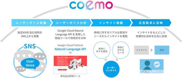 トランスコスモスは、AIを活用しSNS上のリアルタイムな声から消費者の心を動かす広告訴求を開発するメソッド「coemo」を提供開始する。AI部分は、「 Google Cloud Natural Language API 」を活用する。