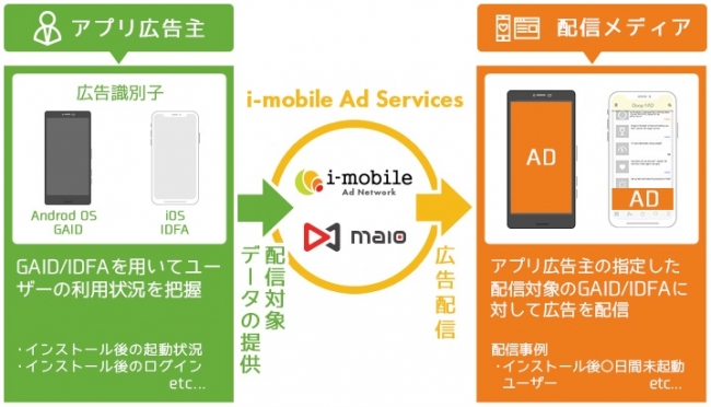 アイモバイルは、アドプラットフォーム事業「i-mobile Ad Network」「maio」においてアプリ事業者が自社で持つ広告識別子に対して、リエンゲージメント広告を配信できる商品の提供を開始した。