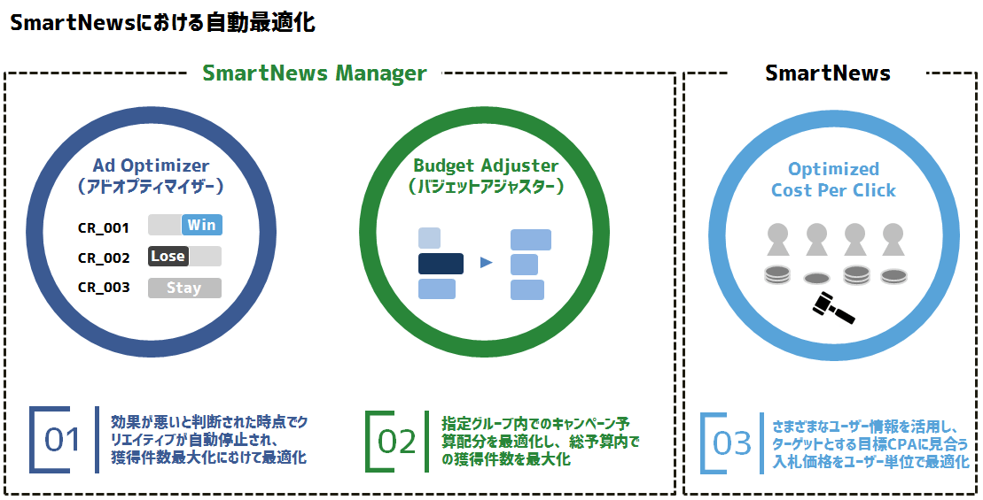 「Ad Optimizer(アドオプティマイザー)」および、「Budget Adjuster(バジェットアジャスター)」の2つのソリューションをパッケージ化することで、より自動化した運用を実現し、「SmartNews Ads」の広告効果の最大化を図っていく。