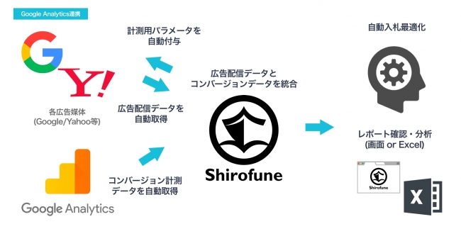 連携の実現により、キーワードや広告ごとの広告効果計測用パラメータがShirofuneから自動的に付与され、Googleアナリティクスから重複の無いコンバージョンデータを自動取得することが出来るようになるとのことだ。