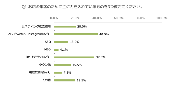 店舗集客のための注力手法は、SNS、DM、リスティング広告が主要