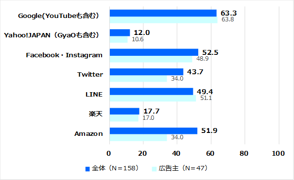 広告サービスに独自性がある広告プラットフォームについて聞いたところ、回答者全体においてはGoogleと回答した割合が最も多く、これにFacebook(・Instagram)、Amazonが続いた。一方で、広告主における回答では順位の入れ替わりがあり、Google、LINE、Facebookの順となった。