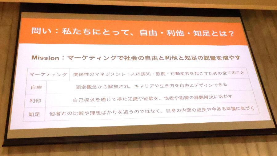 議論の末に定められた新ミッションが、「マーケティングで社会の自由と利他と知足の総量を増やす」である。田中氏は、この言葉を完成された答えではなく、今後の活動と対話の軸として位置づけた。