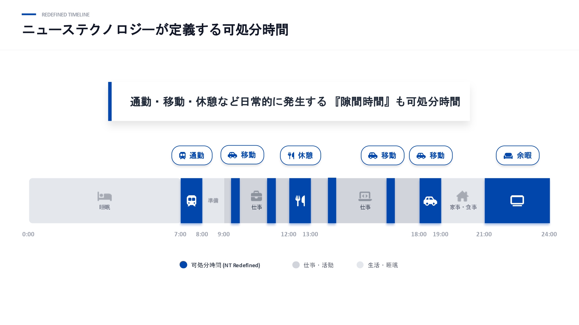 家事などを除き自由に使える時間(従来定義の可処分時間)だけではなく、タクシー移動や喫煙所の休憩も可処分時間の一つと捉えたうえで、次のように述べた。
