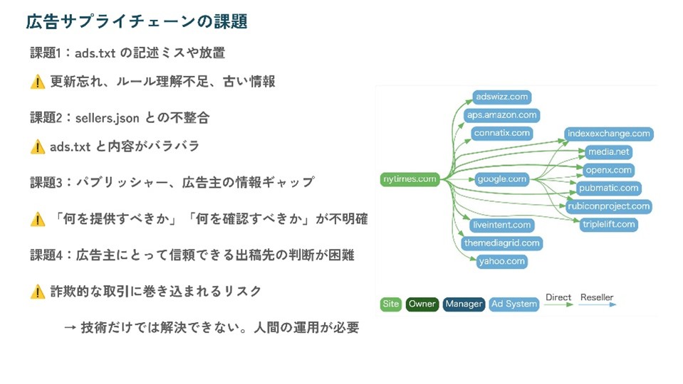 技術仕様としては優れたads.txtやsellers.jsonも、人間が正しく運用しなければ本来の機能を発揮しない。この「運用の空白」をいかに埋めるかという問いが、APTI設立の出発点となっている。