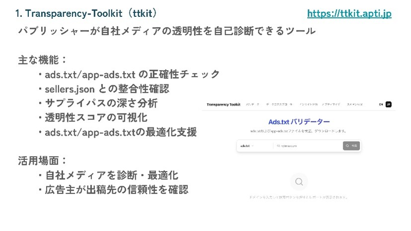 従来のads.txtバリデーターが表記エラーの指摘にとどまっていたのに対し、ttkitではsellers.jsonとの整合性チェック、サプライパスの深さ(ホップ数)分析、オープンデータを活用した広告価値のインサイトレポートまでを一元的に提供する。