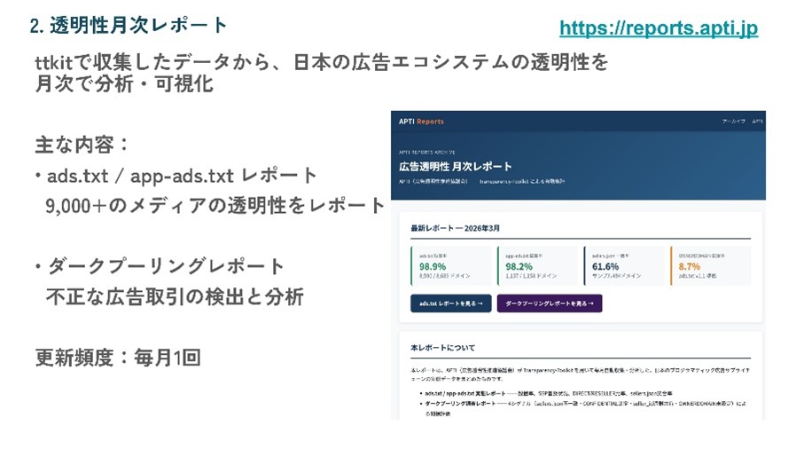 2つ目は「透明性月次レポート」だ。ttkitで収集した約9,000ドメイン以上のデータをもとに、日本のプログラマティック広告サプライチェーンの現状を定点観測する。