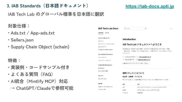 3つ目は「IAB Standards」プロジェクト。IAB Tech Labが策定するads.txt、sellers.json、OpenRTBなどのグローバル標準仕様書を日本語に翻訳し、さらにMCPサーバーとして構築することで、ClaudeやChatGPTなどのLLMから仕様に関する質問を日本語で行える環境を整備した。