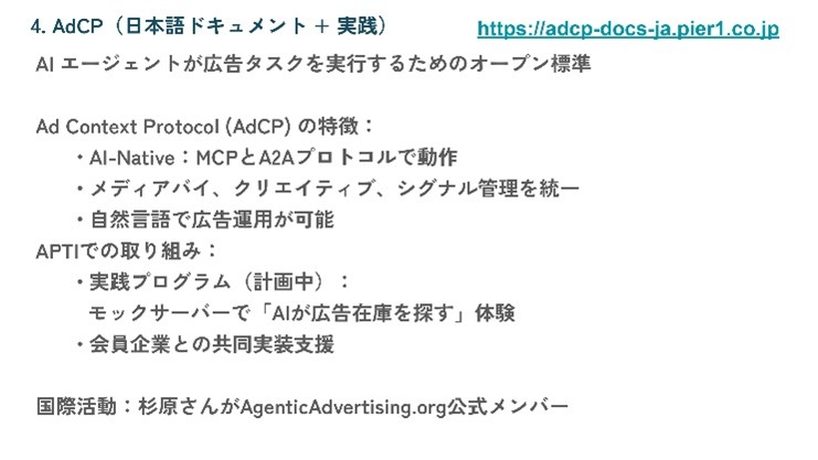 将来的にDSPやSSPの管理画面を介さず、AIエージェント同士が対話して広告取引を行う世界の到来を見据え、関連する仕様やエージェンティック・フレームワークの議論を踏まえた取り組みとして紹介された。