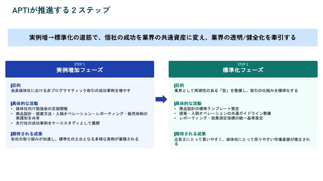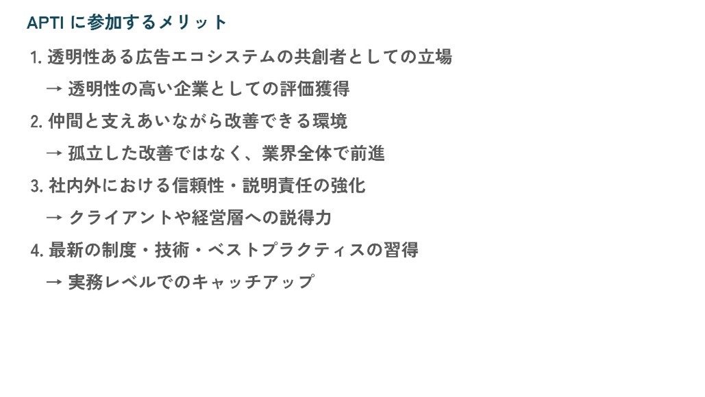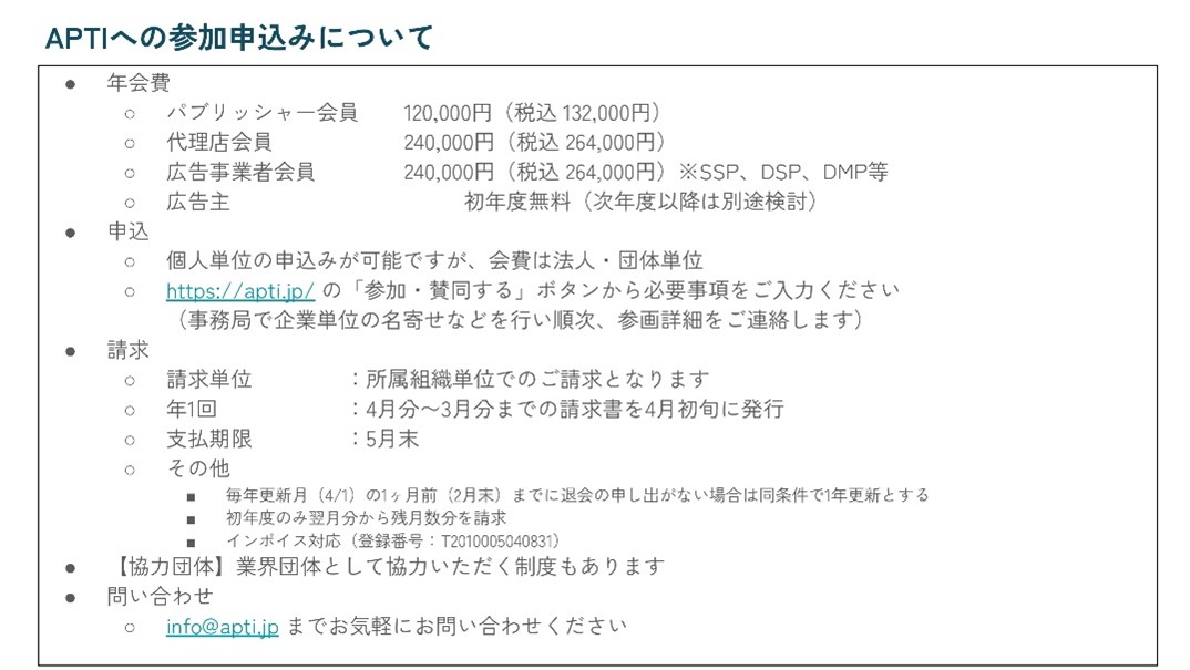 上記のとおりAPTIではこの取り組みに賛同していただける広告業界各プレイヤーの入会を募集している。