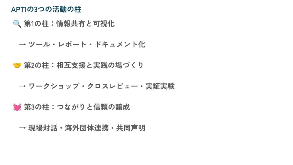 こうした課題に対し、APTIは3つの活動の柱を掲げる。